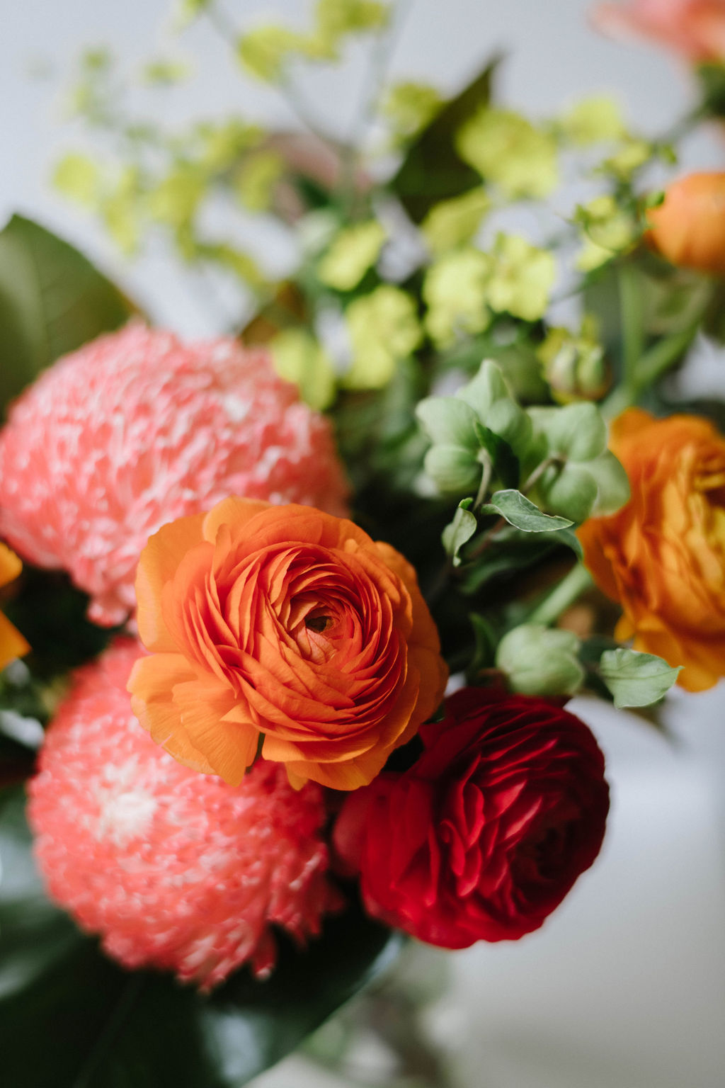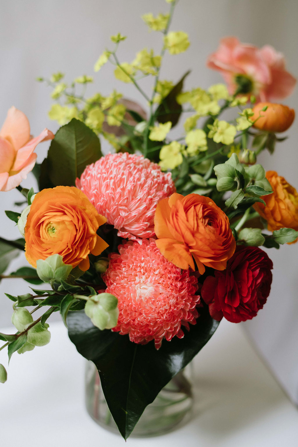 A selection of seasonal flowers and foliage stylishly arranged in a bright palette.