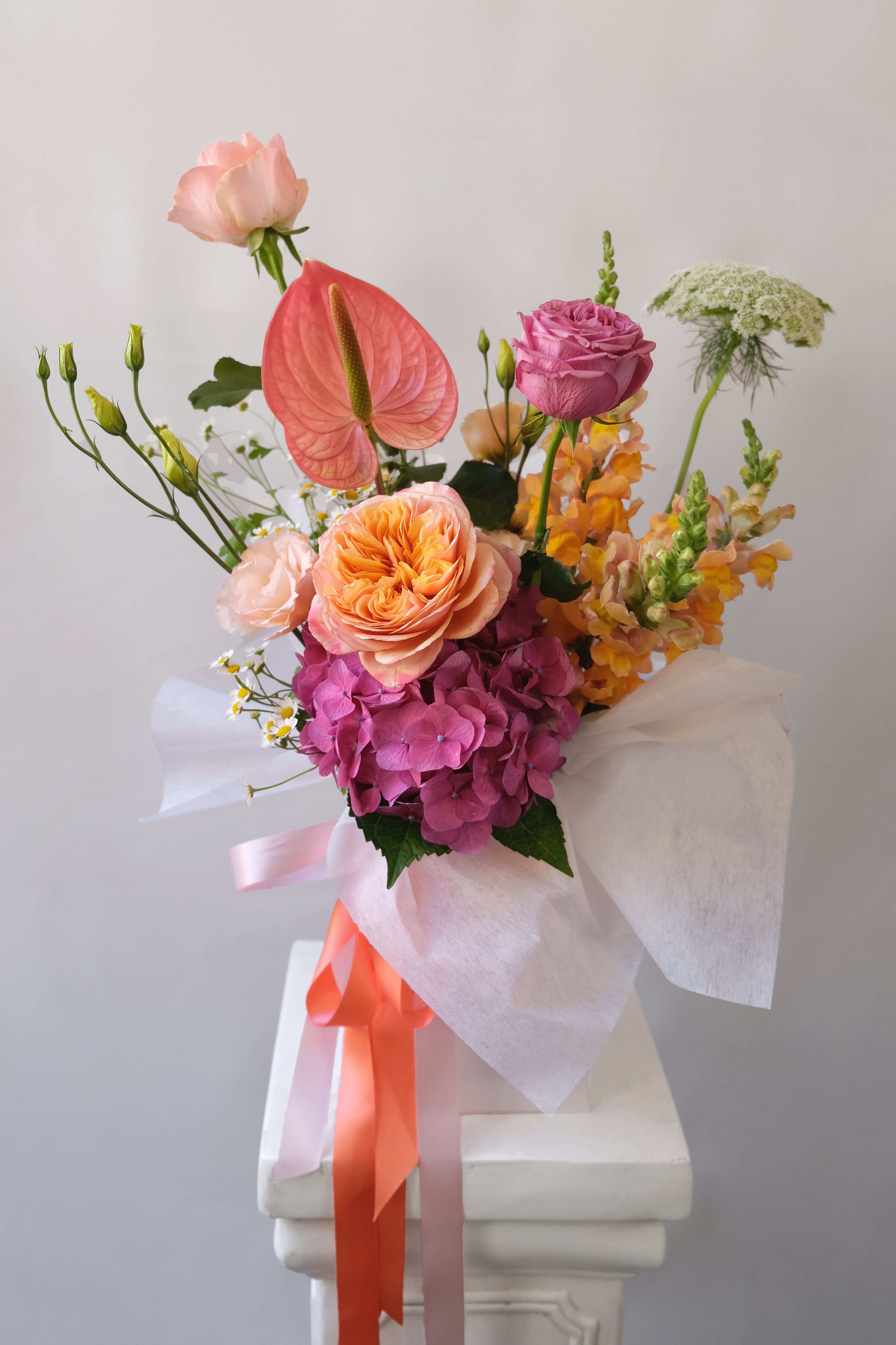 A beautiful selection of bright seasonal blooms presented in our signature white box.