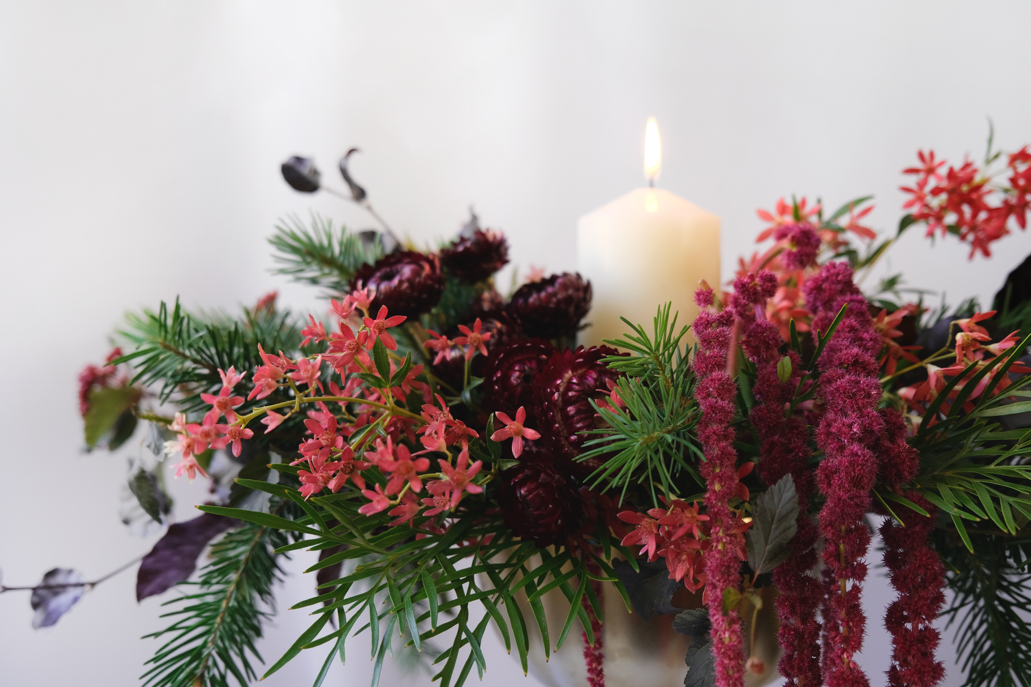 Elevate your Christmas table this year with this gold urn arrangement of fresh Christmas foliage finished with a pillar candle.
