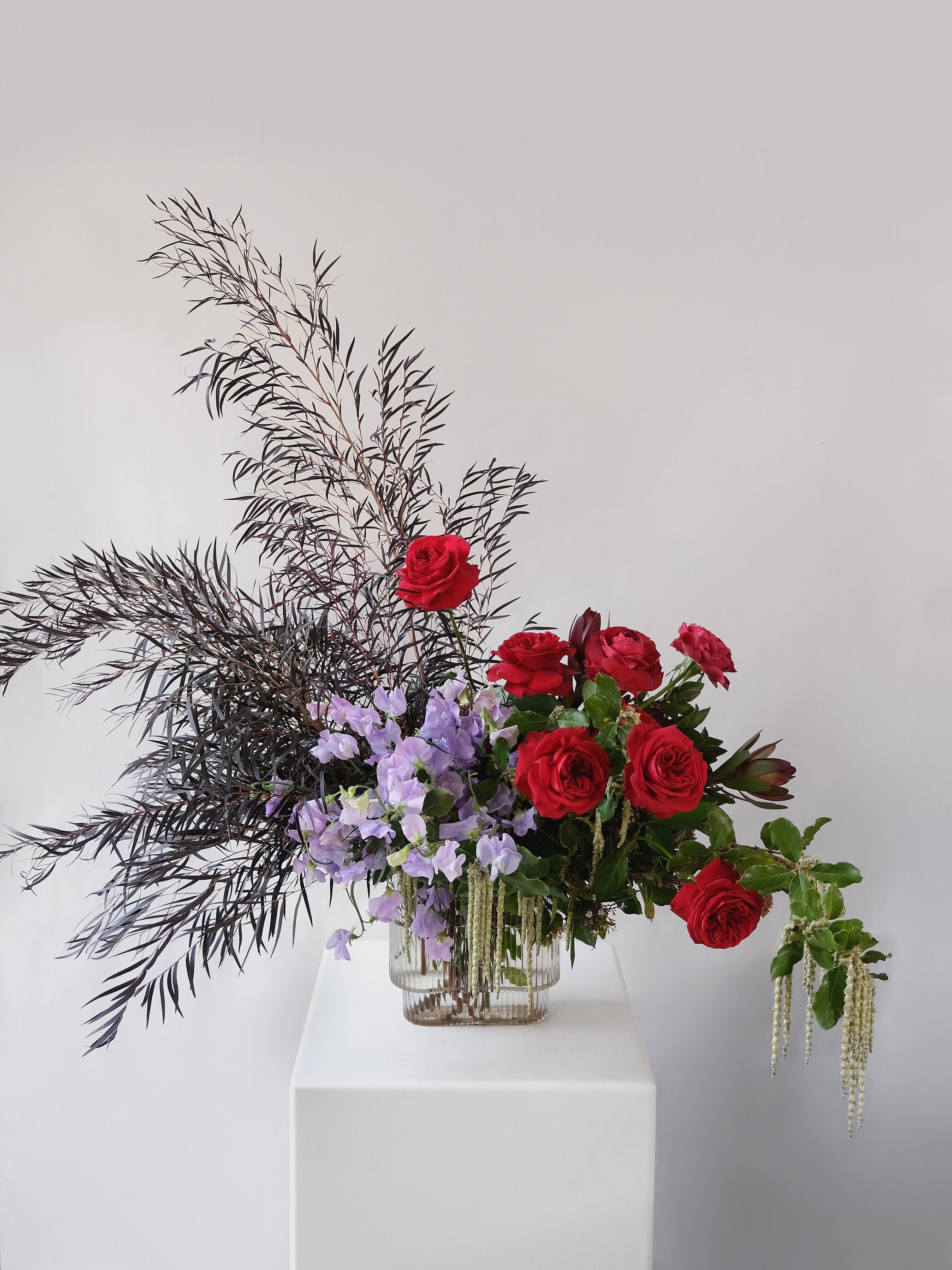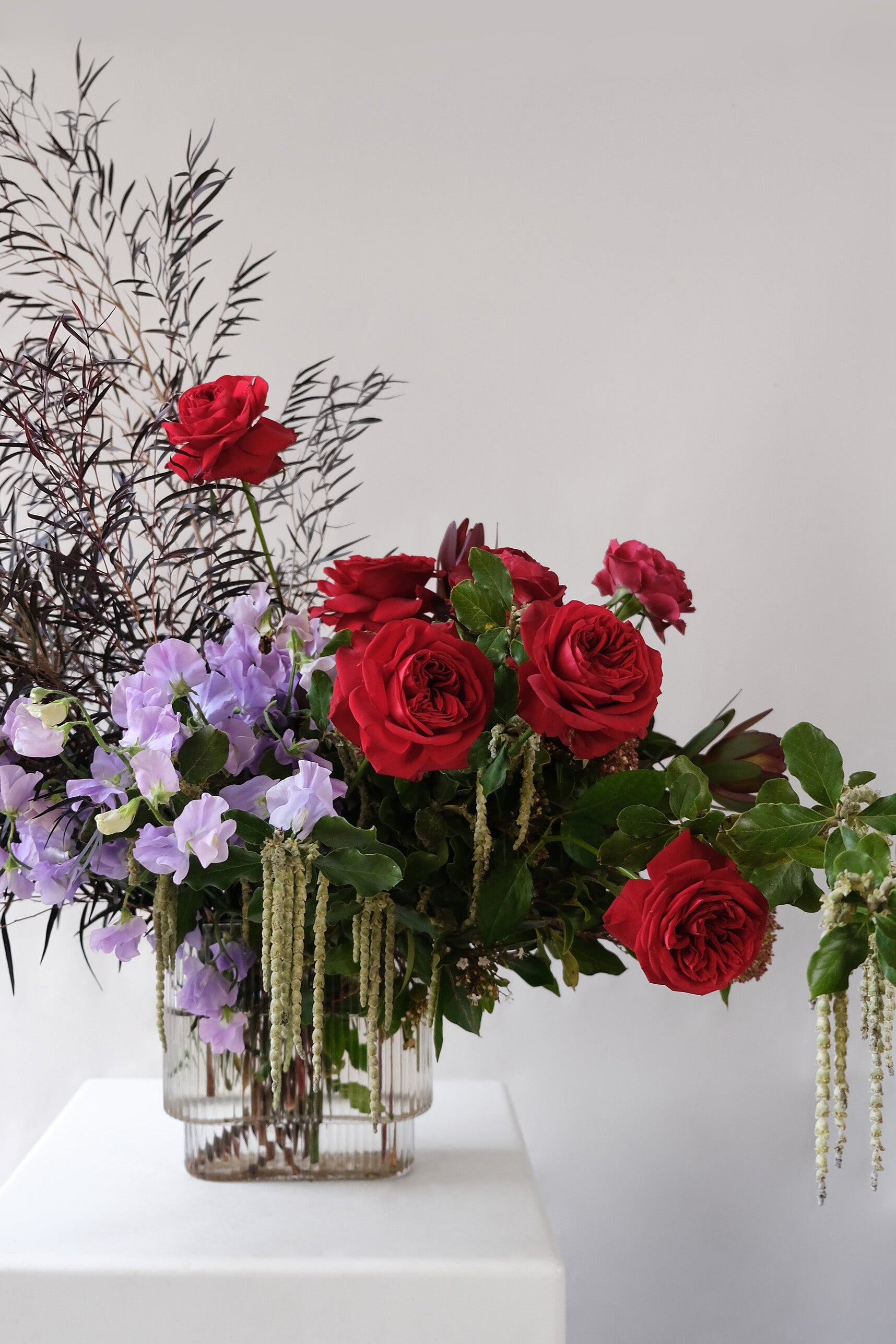 A large vase arrangement featuring premium seasonal flowers and foliage.