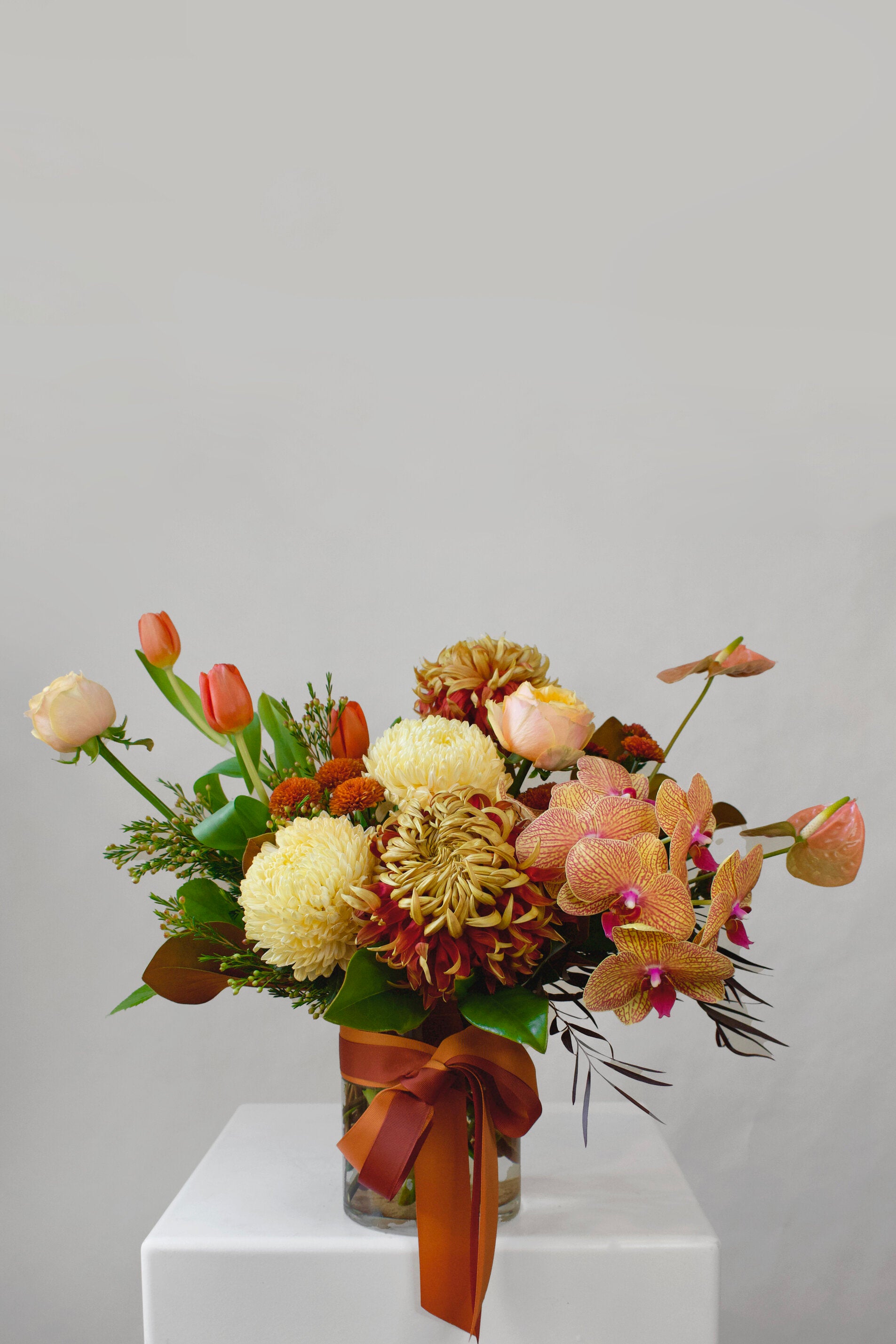 The image provided is for colour and style inspiration for your arrangement. Flower variety and colour tones will depend on season and market availability. Please trust us to select the most beautiful flowers available on your behalf.