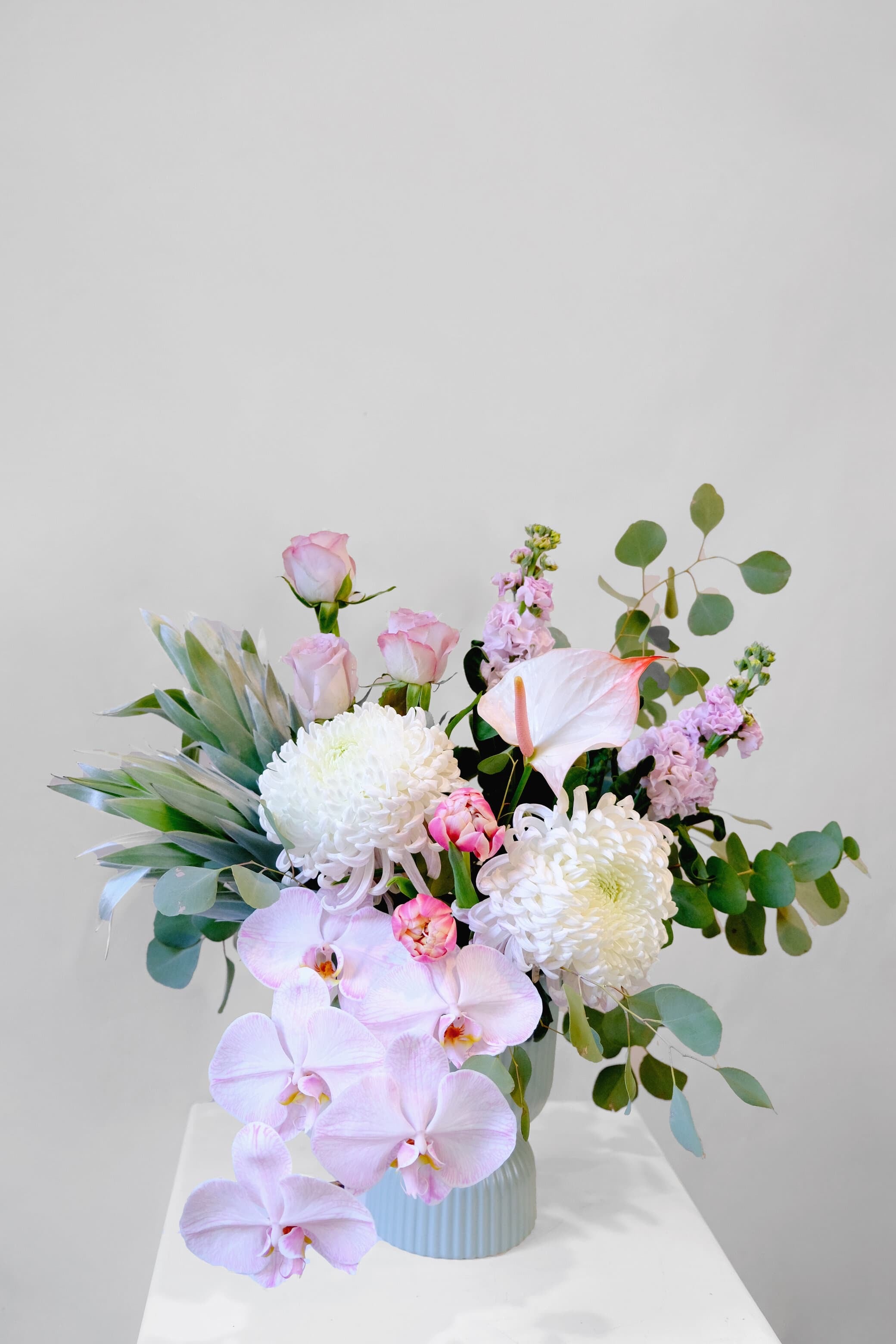Arrangement comes in a soft duck egg blue ceramic vase. Available in small and large.