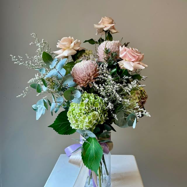 A seasonal bouquet in pastels tones of latte, blush, mauve, white and green.